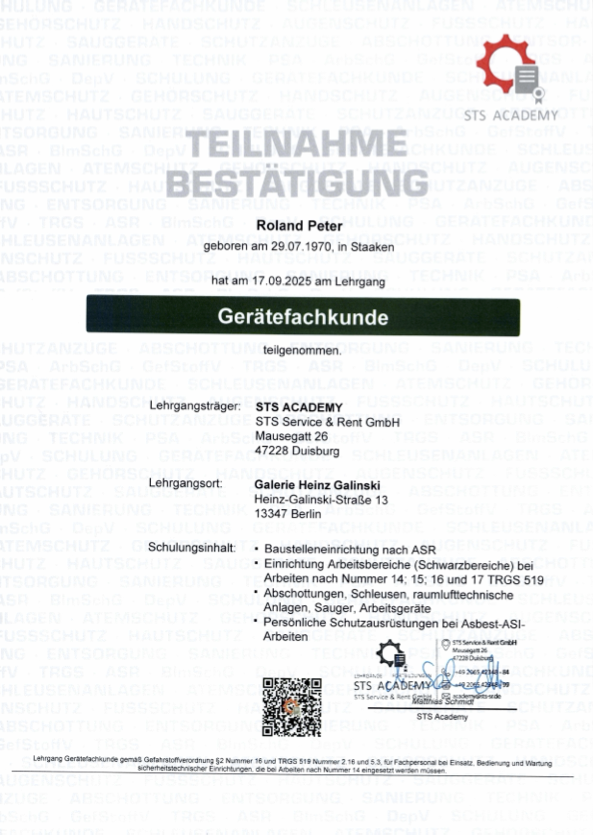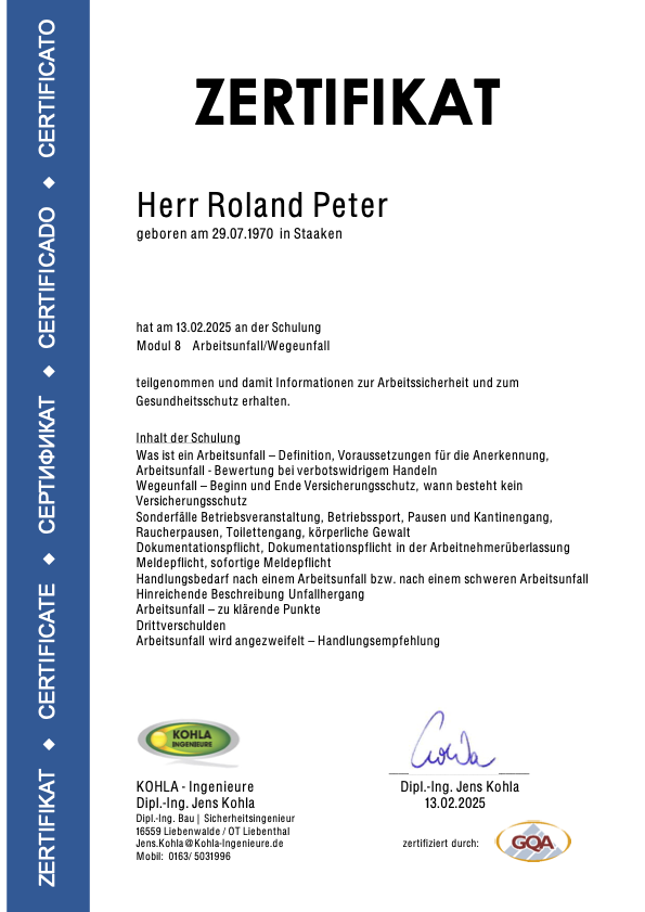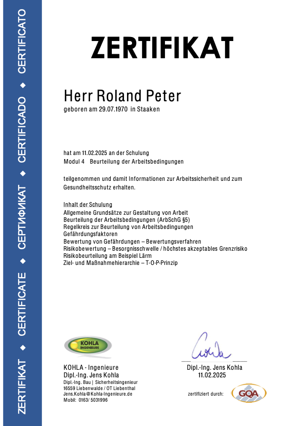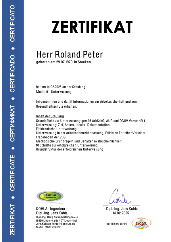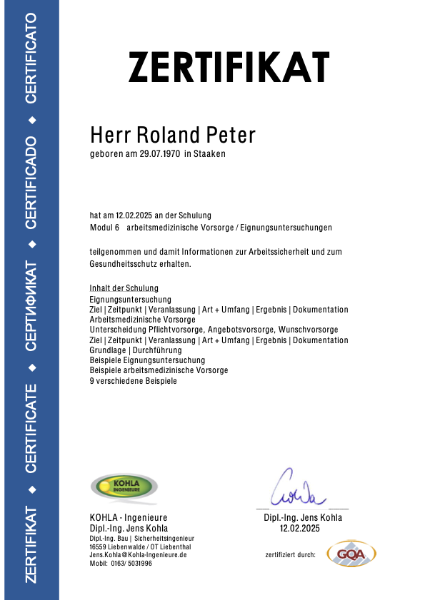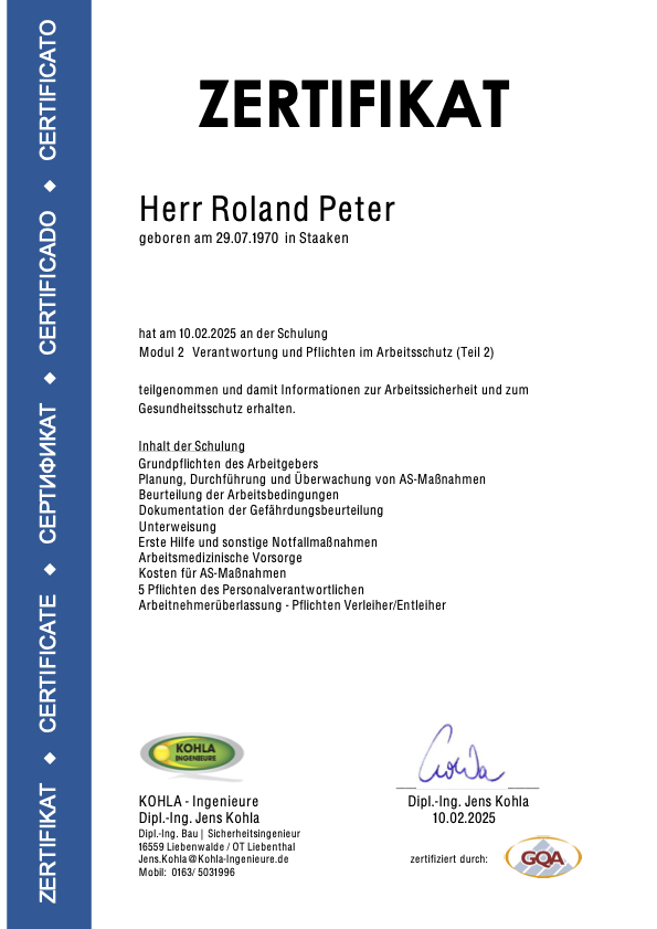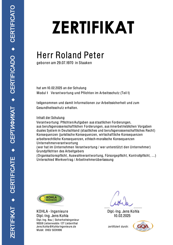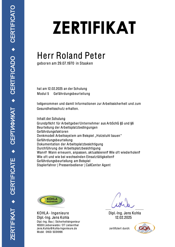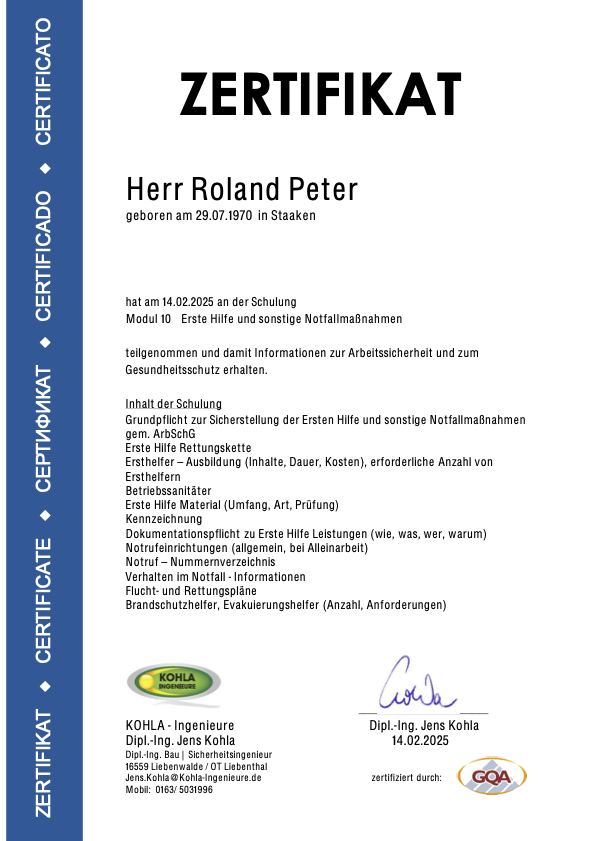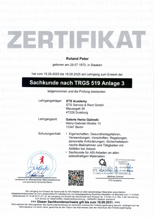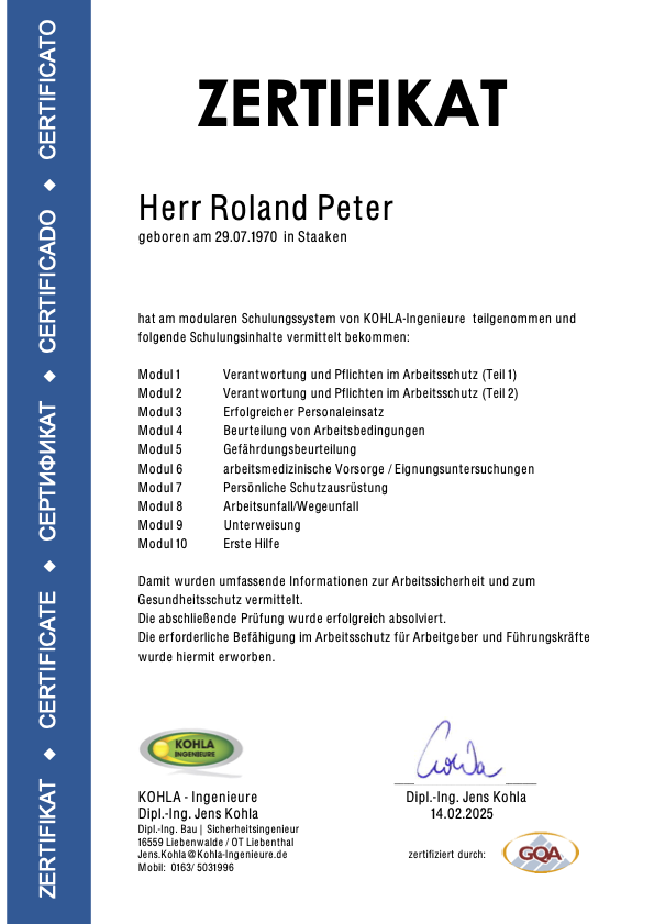 Die nachfolgenden Zertifikate dokumentieren die umfassende Qualifikation von Roland Peter im Bereich Arbeitssicherheit, Gesundheitsschutz und Sanierungstechnik.
