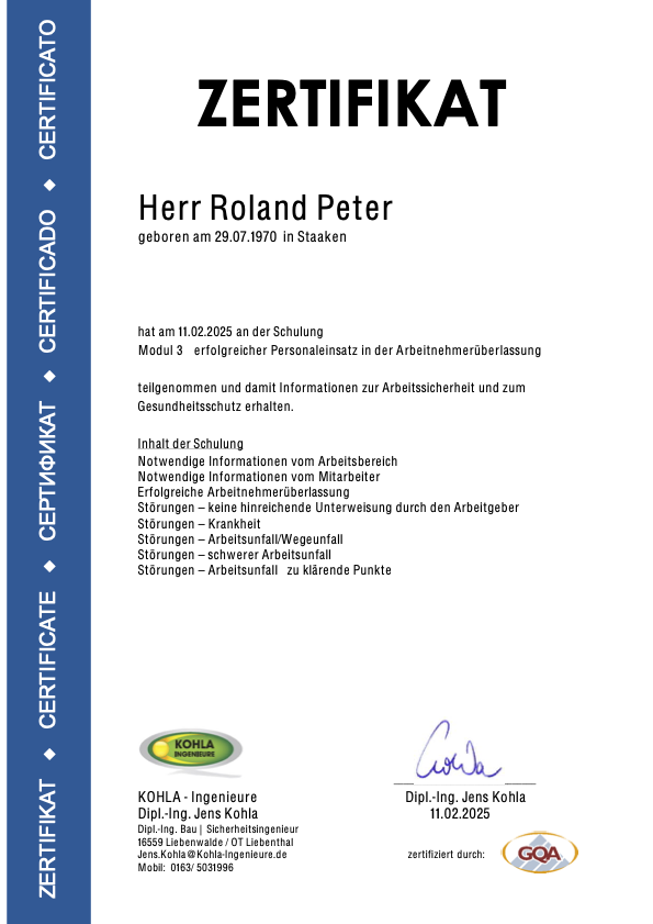 Roland Peter hat erfolgreich am modularen Schulungssystem der KOHLA Ingenieure teilgenommen.