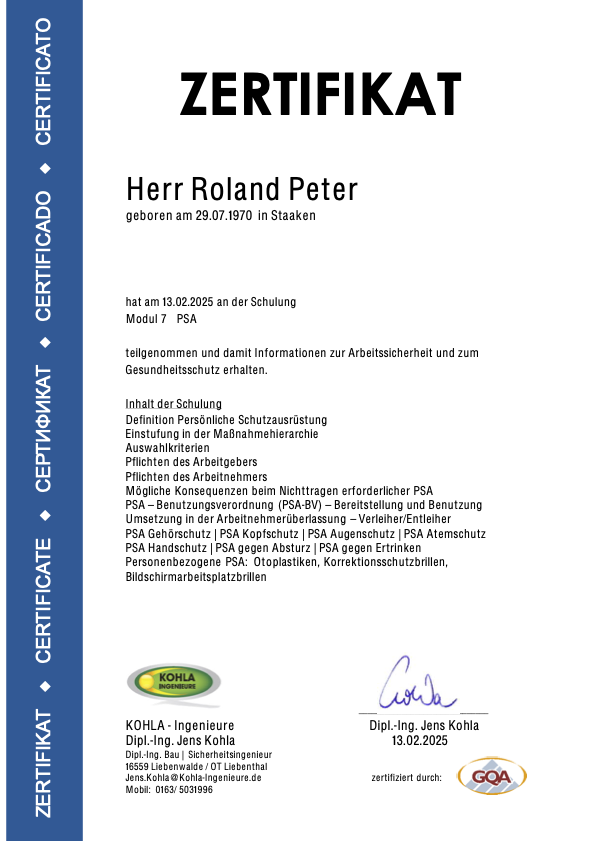 Diese Zertifikate bestätigen, dass Roland Peter sämtliche gesetzlichen Qualifikationen im Arbeitsschutz
