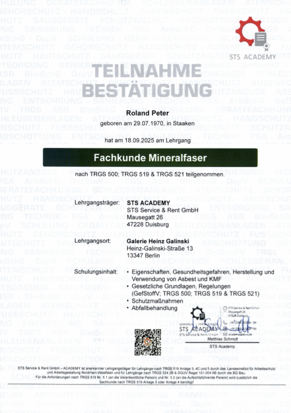 Diese Nachweise bestätigen die Befähigung zur sicheren Durchführung von Asbest-, Schadstoff- und Schimmelsanierungen nach TRGS 519.